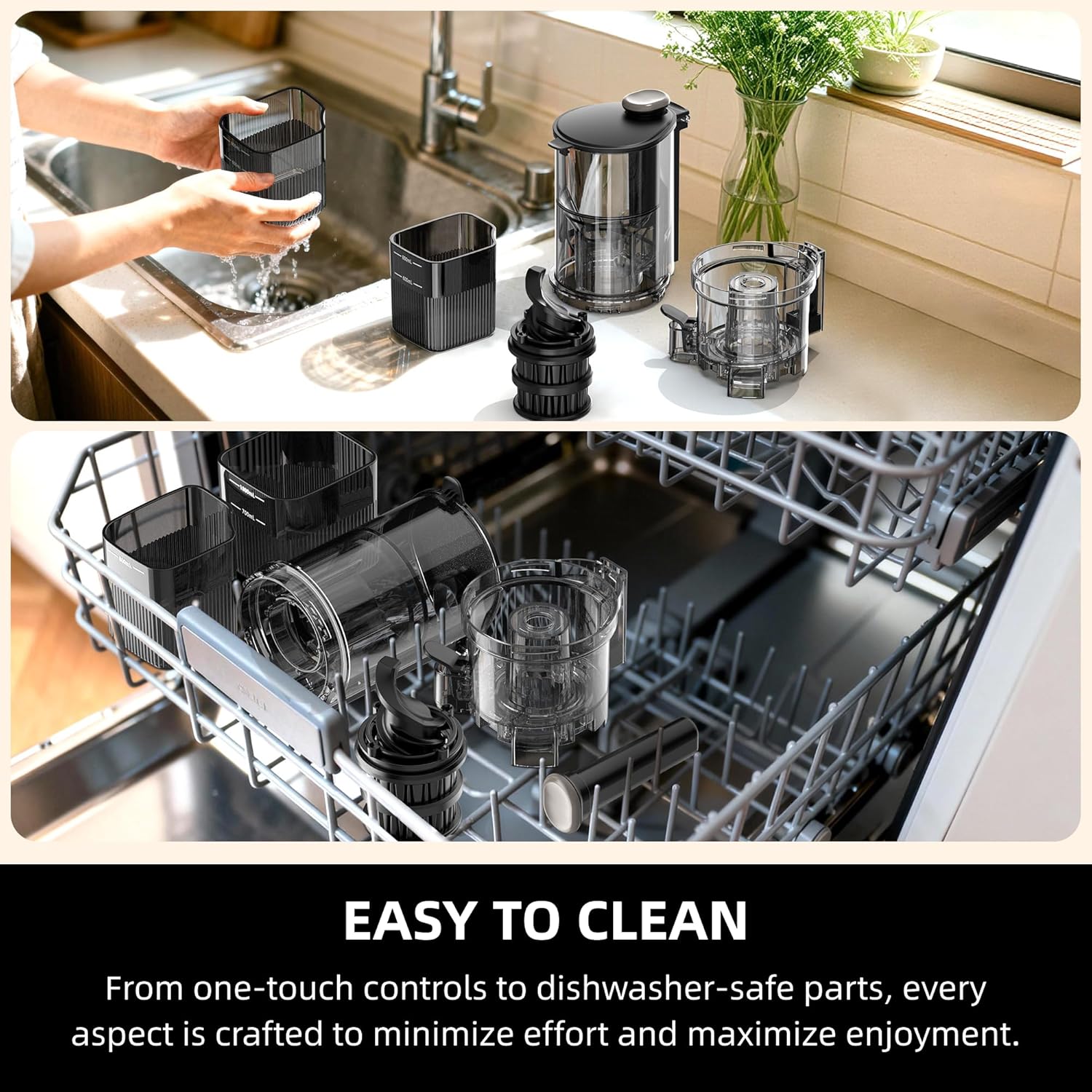 - 【Dishwasher safe & BPA-Free】This slow juicer cold press features a reinforced base for stable, wobble-free operation during juicing. Dual-channel outlets separate juice and pulp simultaneously. With one-touch control, it’s easy and safe to use. Made of BPA-free materials, the parts are dishwasher safe and simple to reassemble.