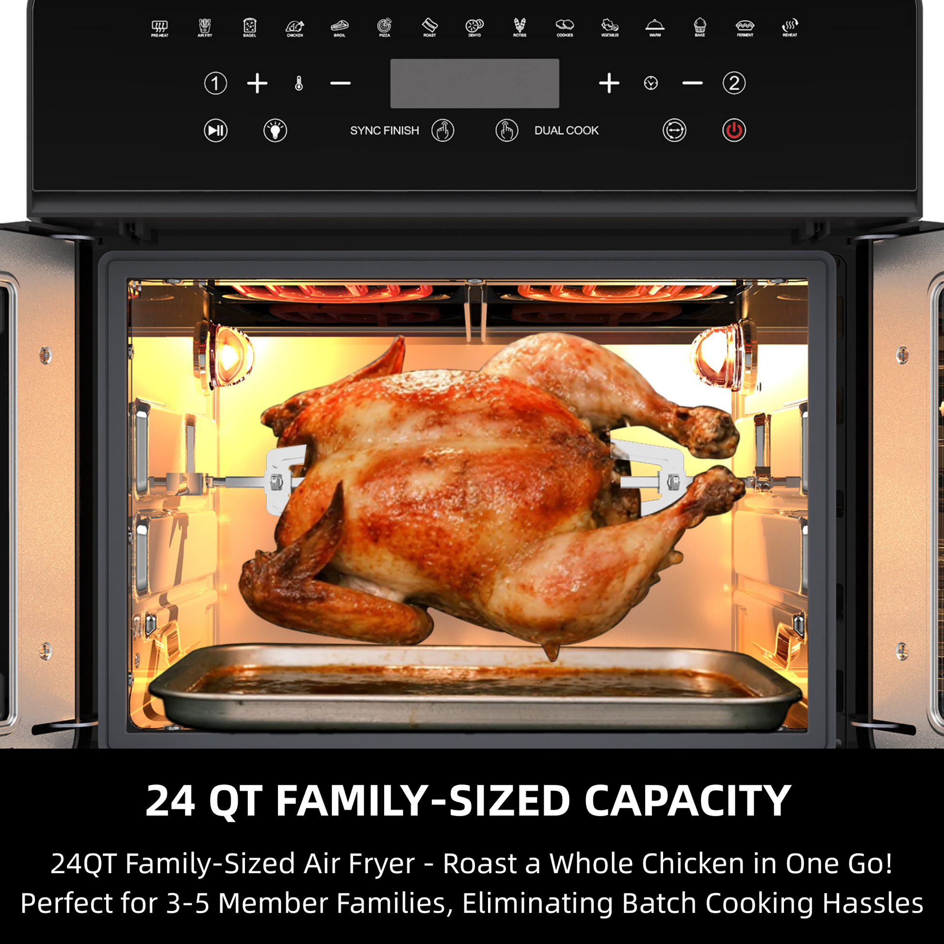 - ใ๐ฎ๐ฐ๐ค๐ง ๐๐ซ๐ง๐ฅ๐-๐๐๐ฅ๐๐ ๐๐๐ฃ๐๐๐๐ง๐ฌใ: Designed for flexibility, this 24QT XL air fryer toaster oven easily handles meals for 4-6. Fit a 4lb chicken or 12-inch pizza, and remove the divider to maximize space for larger items. Complete with 15 essential accessories, itโs your all-in-one solution for family cooking and effortless entertaining.